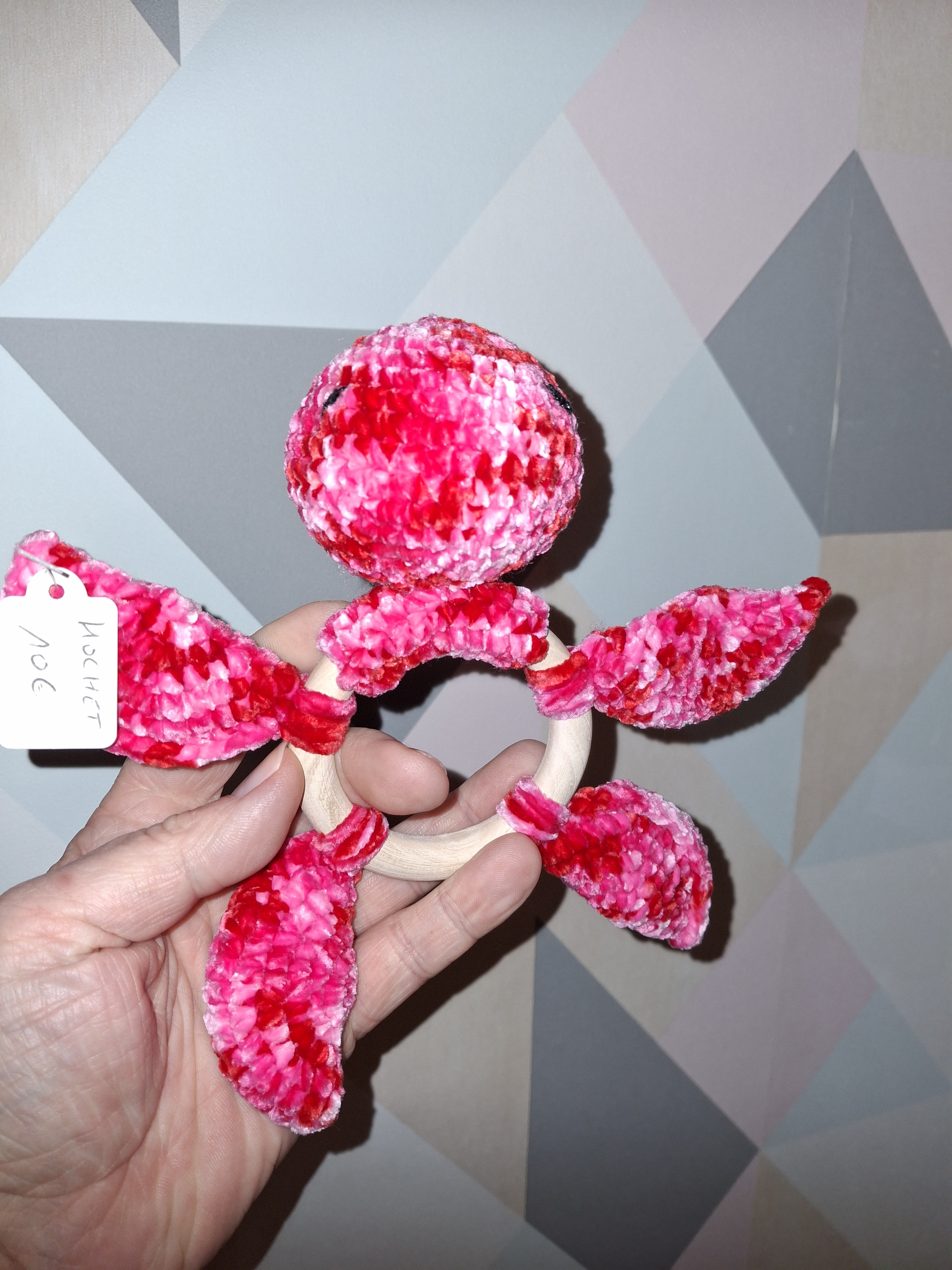 Hochet Tortue au crochet en laine chenille, autour d'un Anneau en bois, yeux brodés et grelot dans la tête